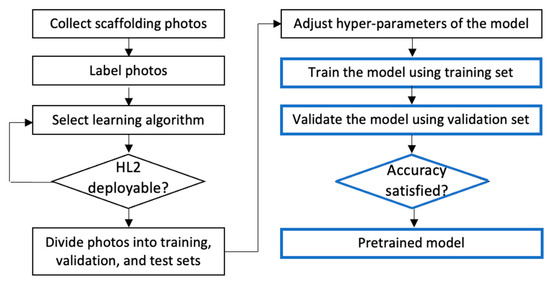 We used a deep machine learning model to automatically recognize assembly deficiencies in scaffoldings. Figure 2 depicts the process of establishing a pretrained model for recognizing deficiencies in scaffolding assemblies. The boxes on the left represent the process of preparing the training data and selecting a suitable deep learning algorithm, including collecting photos of both qualified and unqualified scaffolds, labeling scaffolding frames accordingly, developing a machine learning model, and testing the feasibility of deploying the developed algorithm on the HL2 platform. After the algorithm was developed, a machine learning model was built using Python, and the collected photos were randomly divided into training, validation, and test sets. Totals of 4240 and 530 images were used to train and validate the deep learning model, respectively. Figure 3 shows some labeling examples on the images.