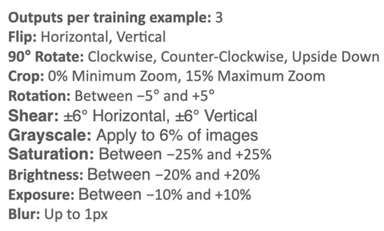We employed Roboflow to undertake the transformation and expansion of the collected image data. The concept behind expanding the image datasets involves randomly generating diverse images based on the original images while controlling certain parameters. This approach allows for the acquisition of a larger and more diverse image dataset for training the model. Figure 4 illustrates the parameters utilized for expanding the images. Specifically, we instructed Roboflow to generate three additional images for each original image. These additional images were produced by applying horizontal or vertical flips, employing various rotation methods, and introducing degrees of cropping and shearing. To simulate different shooting conditions, encompassing scenarios with both good and poor lighting conditions, we modified the default deviation values for exposure, brightness, and saturation to 10%, 20%, and 25%, respectively. It is important to note that appropriate deviation values are those capable of generating images resembling various lighting conditions while retaining the visibility of scaffolding deficiencies recognizable by the human eye.