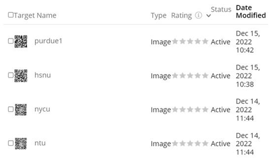 The Vuforia platform [34] offers a range of marker types with varying complexity ratings. Markers can take the form of images or objects possessing multiple discernible features. The complexity of markers influences the ease and precision of recognition, with more intricate markers enhancing recognition accuracy but requiring additional time for processing. In our approach, we opted for QR-codes based on the name of the buildings’ locations as the markers because of the reliability of QR-code detection. Figure 5 presents the recognizability ratings of the QR-codes we employed, as evaluated by Vuforia.