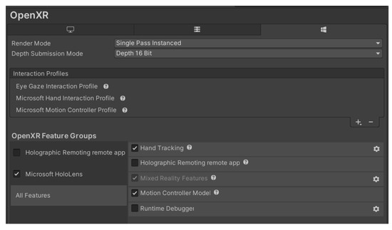 In this study, we employed the Vuforia Engine [32] to integrate augmented reality (AR), Unity, and Microsoft’s Mixed-Reality Toolkit (MRTK), specifically for hand gesture recognition and other functionalities. For the initial stages of development, we utilized the Vuforia HoloLens 2 Sample, available on the Standard Unity Asset Store [33]. This sample provided a pre-configured Unity scene and project settings, serving as a foundational framework for the creation of a tailored application.
