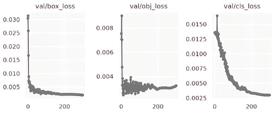 Since we did not have access to the codes of the models trained in the Roboflow platform environment, we recreated the YOLO v5 version of the model by using the pytorch package of Python, where we set batch = 16, epoch = 300, and learning_rate = 0.01. The expanded image dataset was used to train and test this model. Table 3 shows the mAP and the corresponding precisions of this self-built model for the qualified, missing cross-tie rod, missing lower-tie rod, and missing footboard classes. The test mAP was 0.89, with precision values of 0.96, 0.82, 0.90, and 0.89 for qualified, missing cross-tie rods, missing lower-tie rods, and missing footboard types of deficiencies, respectively. Table 4 and Figure 7 summarize and illustrate the losses of this model during the validation phase. Figure 8 depicts the convergence of precision, recall, and mAP in the validation phase. The precision data indicate that the results obtained using the trained model were satisfactory. The trained model was then used as the deficiency-recognition module in SADDS.