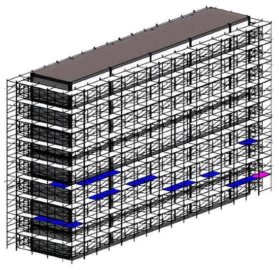 Figure 10 and Figure 11 present examples of the recognition results obtained at these two test sites. Automated detection of the target deficiencies worked successfully, and most of the scaffolding frames were found to be qualified (green label), twelve had missing lower-tie rods (purple), two had missing cross-tie rods (magenta), and one had a missing footboard (red). The following lessons were learned from the field tests:
