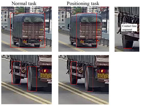 The process of vehicle trajectory recognition involves utilizing machine vision to extract the identification box of the vehicle target, obtaining the pixel coordinates of the recognition box, and subsequently converting them into bridge coordinates. Firstly, it is necessary to create a training dataset to train the neural network to learn the features of vehicle images. In the field of machine vision, recognition tasks typically involve completely enclosing the outline of the target. However, for the specific task of vehicle localization in this study, such a strategy is not suitable because it is challenging to extract the required localization points rationally from such recognition boxes. Therefore, a targeted annotation strategy needs to be designed, as illustrated in Figure 2.