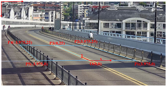 After completing the creation of the training dataset, the YOLOv4 neural network is trained to recognize vehicle and wheel targets in surveillance videos. Upon obtaining the image coordinates of the vehicle and wheel targets, it is necessary to convert them into bridge coordinates for use in vehicle weight recognition. The relationship between the image coordinate system and the bridge coordinate system is illustrated in Figure 3, and it involves a homography transformation [32]. This transformation represents the mapping relationship of points on the same plane in two different views of the images, as shown in Equation (1).