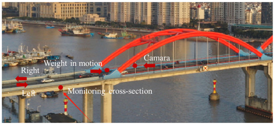 The focus of this study is a four-span continuous beam bridge connected to a large arch bridge. The monitored span is the first bridge span adjacent to the arch bridge, and real-time monitoring of the dynamic displacement at the mid-span is conducted using millimeter-wave radar technology. This monitoring approach enables all-weather, non-contact, high-precision, and multi-target measurement of dynamic displacements, addressing common challenges in displacement monitoring. Additionally, in addressing challenges related to influence line calibration, this study uses the WIM system and associated camera devices installed on the arch bridge as a source of information for recognizing and calibrating vehicle parameters. By adjusting the camera’s shooting angle, the monitoring field of view can cover the entire monitored span, forming the basis for vehicle trajectory recognition. The subject of this study is illustrated in Figure 5.