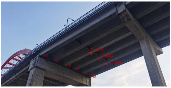 The vertical displacement of the beams is sampled at a frequency of 50 Hz, while the camera operates at a sampling rate of 25 frames per second (FPS). The monitored structure consists of six beams, with measurement points located at the mid-span of beams labeled 3#, 4#, and 5#, as illustrated in Figure 6. The WIM system is positioned on the arch bridge, approximately 10 m away from the monitored span. The camera is installed near the lighting pole of the WIM system, at a height of approximately 5 m.
