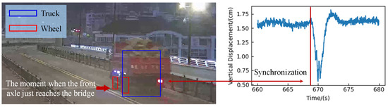 Due to the asynchronous installation of the B-WIM system and millimeter-wave radar monitoring equipment, the lack of clock synchronization among the involved parties poses a significant challenge to data mining. In order to effectively utilize the monitoring data from both video and dynamic displacement, it is imperative to perform data alignment. This paper adopts a manual alignment approach, where key moments during the vehicle’s bridge entry are observed through video monitoring. For instance, by aligning the moment when the front axle of the vehicle just enters the bridge with the initial loading moment leading to static displacement, as illustrated in Figure 7, based on these observations, data alignment is achieved.