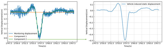 Bridge dynamic displacement includes long-period components generated by factors such as temperature, vehicle-induced static displacement components, vehicle-induced dynamic displacement components, or noise components. In this study, the analysis focuses on utilizing the vehicle-induced static displacement component for identifying the influence lines and vehicle weight information. The research employs the LOWESS algorithm, which conducts weighted regression within a local window range. To elaborate, the window length for isolating the temperature-induced long-period component was set at 300 s, while the window length for extracting the vehicle-induced static component was configured at 1 s. By adjusting the length of the window, the algorithm can separate displacement response values associated with different periodic components. The separation process is illustrated in Figure 8.