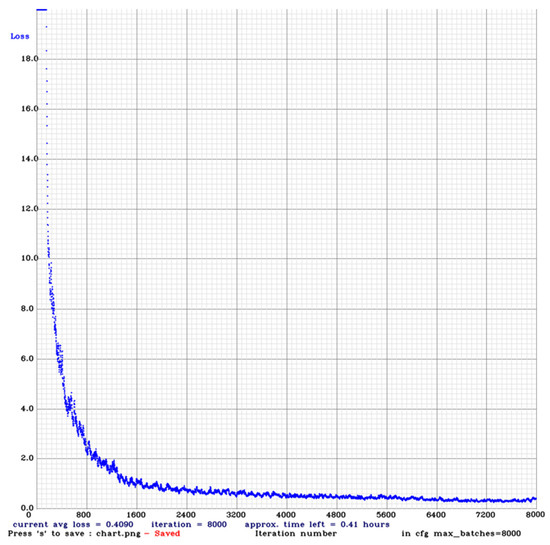 Based on the annotation strategy described in Section 2.1, a total of 1436 vehicles and 2324 wheels were annotated. With a batch size of 64 and training iterations set to 8000, the training process of YOLO v4 is illustrated in Figure 9. The training of the model in this study occurred on a machine equipped with an NVIDIA GTX1650 graphics card featuring 4 GB of memory. The training process spanned approximately 26 h.