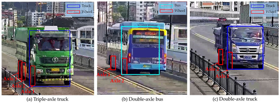 This study selected 16 driving scenarios to validate the effectiveness of the algorithm. These scenarios cover bidirectional vehicle travel with speeds ranging from 20 to 70 km/h. The chosen vehicle types include double-axle buses, double-axle trucks, and triple-axle trucks. The vehicle types and axle numbering are illustrated in Figure 12. It is noteworthy that the last two axles of the triple-axle truck belong to the same axle group with close axle spacing.