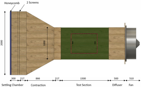 Figure 1. Side view of the final design of the wind tunnel. The dimensions are given in mm.
