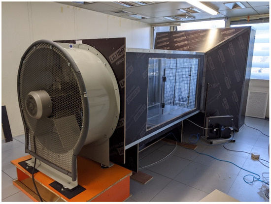 Figure 2 shows the wind tunnel. The wind tunnel was installed in a 4.60 × 6.75 m2 dedicated room. The wall behind the settling chamber of the wind tunnel was more than 1 m away from the honeycomb, which respected a half-diameter limit. Therefore, it did not disturb the flow inside the wind tunnel. The wind velocity was recorded by a directional hot wire anemometer installed at 0.25 m from the ground and at the entry of the testing chamber (windward side). The pressure reference was recorded by a manometer connected to a pressure tap installed next to the anemometer.
