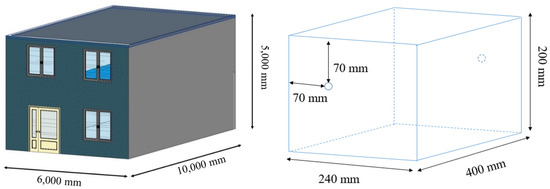 The study focused on a generic two-story house, as illustrated in Figure 3 (left). Its effective leakage area (ELA4) was 0.0142 m2, aligning with the limit value required for new houses in the current French EP regulation (RE2020). To avoid the need for blockage analysis and correction in the testing chamber of the wind tunnel, the cross-section of the building model had to be below 5% of the testing chamber cross-section (0.05 m2). This limit was defined by the ASCE, as indicated by Choi and Kwon (1998) [33]. The cross-section of the real house was 6.0 × 5.0 = 30.0 m2. Using a scale ratio of 1/25, the cross-section of the model was 0.20 × 0.24 = 0.048 m2, respecting the 5% limit. The model dimensions are presented in Figure 3 (right).