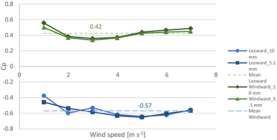 A large variability of the fan pressurization measurement results was observed depending on the air leakage distribution. The zero-flow pressure value could be very high when the leakage was mostly located on the leeward façade (rld < 0.5). For rLD = 0.1 and rLD = 0.2, the zero-flow pressures were higher than 16 Pa (5*zero-flow pressure higher than 80 Pa) at 7 m·s−1, whereas the limit value in ISO 9972 was 5 Pa. Thus, only measurements for wind speeds up to 3 m·s−1 complied with the ISO 9972 requirements regarding zero-flow pressure. This was consistent with ISO 9972, which noted that a wind speed near the ground above 3 m·s−1 will unlikely lead to a zero-flow pressure below 5 Pa. Conversely, the zero-flow pressure value was lower when the leakage was mostly located on the windward façade (rld > 0.5); from rLD = 0.7 to rLD = 0.9, the zero-flow pressure was higher than 5 Pa only when the wind speed was higher than 5 m·s−1. However, a unique configuration for rLD = 0.6 was observed; the zero-flow pressure was extremely low and stable, with a maximum value of 1 Pa at 7 m·s−1. For this configuration, measurements according to ISO 9972 could be performed for all windy conditions. This seemed to correspond to a specific situation for which the pressure due to the wind is compensated for by the specific leakage distribution and the specific Cp coefficient of the model.