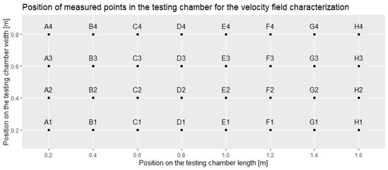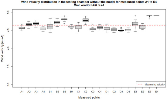 Figure 9. Distribution of the wind velocities in the testing chamber for a mean wind velocity = 4.64 m·s−1—points A1 to E4.