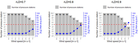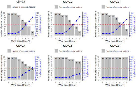 By combining the nine leakage distributions with the eight wind speeds (from 0 to 7 m·s−1), 864 tests across 96 measurements were conducted. For each air leakage configuration and wind speed, fan pressurization measurements were performed according to ISO 9972 and with the parameters described in Section 3.1.1. When possible (depending on the zero-flow pressure), the pressure sequence included 10 tests. Appendix A represents the step-by-step experiment. Figure 10 provides plots of the maximum number of possible tests (grey bars) and the minimal values for the first step (blue line), depending on the wind speed (0 to 7 m·s−1) and each air leakage distribution (rLD from 0.1 to 0.9).