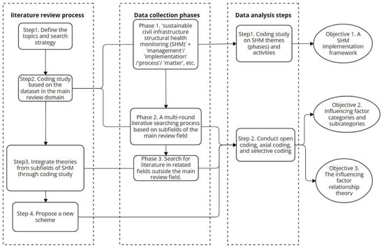 The second step is to conduct a coding study of content in the literature related to influencing factors based on the phases and activities identified in the framework. The main procedures involved in the coding study include open coding, axial coding, and selective coding. Firstly, in the open coding process, the literature in the obtained databases is reviewed based on the established framework, which aims to conceptualize and categorize the influencing factors in the implementation of SHM for sustainable civil infrastructures. Then, the axial coding process continued to generalize the categories based on the results of the open coding from two dimensions (contents and properties). In the final process, the outcomes of the open coding and axial coding are integrated and condensed furtherly in the selective coding, so that a scheme can be summarized and formed.