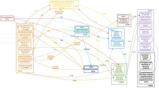 Finally, the role of influencing factors in the prognosis and decision-making stage (P4) is less affected by cross-activity factors compared to other stages. In the development and application of life-cycle models (P4A1), the factors that are susceptible to cross-activity factors are mainly related to the basis used to predict the subsequent life-cycle performance changes of structures, including damage detection results data and structural aging parameters. On the one hand, the time range of damage detection result data (F119) is related to the long-term archiving ability of data storage (P2A5); the quality of damage detection data (F121) depends on the diversity and accuracy of damage detection P3A2 results. On the other hand, the optimal structural aging parameters should be diversity and effectiveness (F122), which also depend on these two characteristics of P3A2 results [135]. Subsequently, the formation of P4A1 prognostic outcomes (including life-cycle curves and risk-rating systems, etc.) often forms the foundation of P4A2 (decision-making activities), and the diversity of information it contains promotes more reasonable decision-making and smoother and lower-cost decision-making processes.