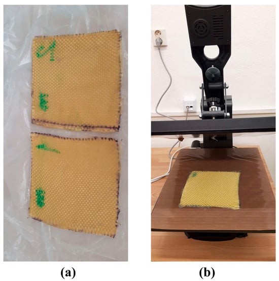 For the Kevlar fabric impregnation, the weight ratio of PVB to fabric was 20 wt.%. All the composite samples comprised two layers of impregnated fabrics. These layers were heated to 170 °C for 30 min in a heat press machine (Yiwu Sunmeta Technology Co., Ltd., ST-4050 model, Yiwu City, province Zhejiang, China)—Figure 1. Three types of composite samples were produced: the No. 1-Kevlar/PVB, No. 2-Kevlar/PVB/1% TiO2, and No. 3-Kevlar/PVB/2% TiO2 samples.