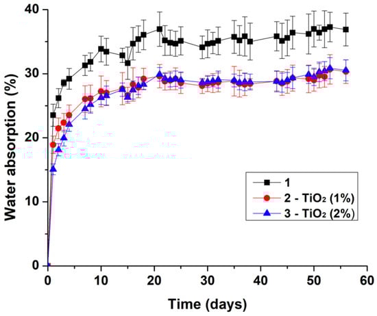 Figure 3 depicts the percentage of water uptake as a function of the immersion time for the three types of specimens. It can be noticed that the water uptake of the Kevlar/PVB specimens (No. 1 composite type) was the highest one (36.9%), while, for the other two types of specimens with TiO2 nanoparticles, the absorption was lower, around 30.5% after 8 weeks of immersion. These results are in agreement with some findings that the water absorption of nanocomposites decreases as the nanoparticles make the barriers for the water molecules to extend in the composites [,].
