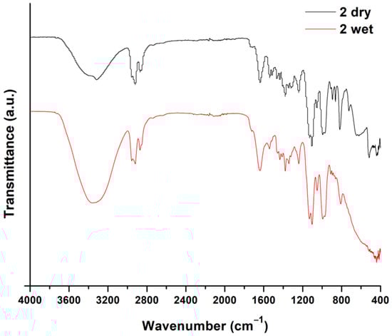 FTIR spectra of: dry and wet Kevlar/PVB/1% TiO2 specimens.