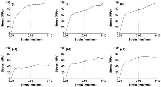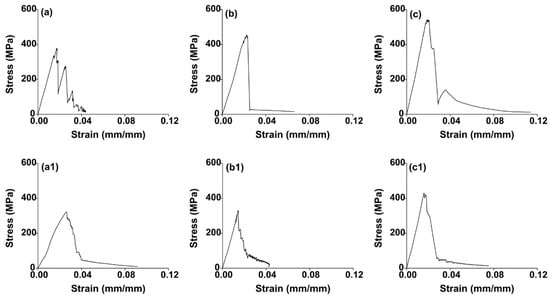 The stress versus strain data plots for the Kevlar/PVB specimens with: (a) no nanoparticles, (b) 1 wt.% TiO2, and (c) 2 wt.% TiO2 nanoparticles; and the immersed ones with: (a1) no nanoparticles, (b1) 1 wt.% TiO2, and (c1) 2 wt.% TiO2 nanoparticles.