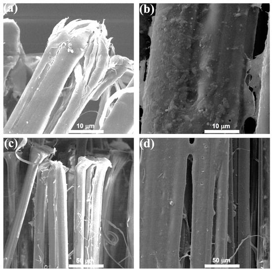 Figure 6 shows the SEM images of the specimens following the tensile tests. The wet Kevlar composite specimens have larger fibers with a rougher surface due to the remaining moisture (images b and d in Figure 6). It can be seen that the wet fibers also coalesced among themselves because of the residual moisture [].