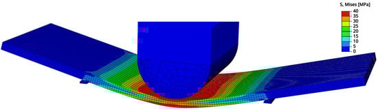 The results of the bending test were used to simulate the bending test in the Abaqus software (v2021). During the simulation, the specimen was bent and the vertical reaction force was recorded (see Figure 8). The Poisson coefficient υ = 0.25 and the friction coefficient f = 0.15 were used in the same way as in [] where the Kevlar/PVB specimens were also subjected to the three-point bending test. Due to the relatively large deformations (related to the size of the tested specimen), the simulation is defined as ‘nonlinear’ which allows us to consider the second-order effects. The simulation was driven by displacement, divided into 20 separate steps, each with a displacement magnitude equal to 0.75 mm. The mesh of the tested specimen was made of C3D20R elements (twenty-node brick elements with reduced integration).