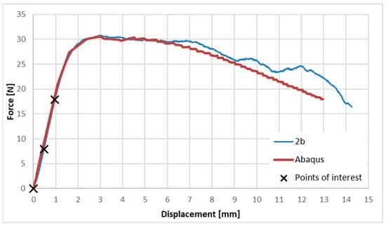 Force-to-displacement curves obtained by Abaqus (red) and experimental testing (blue). Points of interest (×) were used to calculate the inputs for the Abaqus simulation.