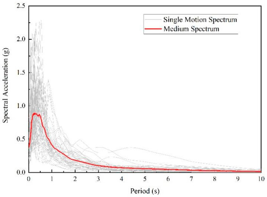 Generally, in the current investigations of ground-motion intensity measures, there are two approaches commonly employed for the selection of ground-motion records. The first is to directly select the ground-motion records recommended in the appendix of FEMA P695 [50] for analysis. The second approach relies on the seismic code to choose ground-motion records depending on the specific characteristics of the site where the structure is situated. Most of the known studies opt for the first method. Furthermore, the process of evaluating the sufficiency of the ground motion entails computing the correlation between the residual of the intensity measure (IM) and the distance from the epicenter, denoted as R. In order to ensure the generality and universality of the research results, it is necessary to ensure enough far-site ground-motion samples. Consequently, a selection of 22 far-field seismic ground motions, as recommended by the FEMA P695 guidelines, sourced from the NGA project database, is employed in the dynamic analysis of a roof-isolated structure in the following sections. Figure 1 depicts the acceleration spectrum of the aforementioned records. The seismic events encompass a range of magnitudes, specifically falling within the interval of 6.5 to 7.9. Additionally, the distance exhibits variability, ranging from 7 km to 23 km. The comprehensive data pertaining to the ground-motion recordings is shown in Table 3. The ground-motion data that have been chosen in the time history analysis have not undergone any scaling. Table 3 presents a comprehensive overview of the ground-motion recordings, providing detailed information.