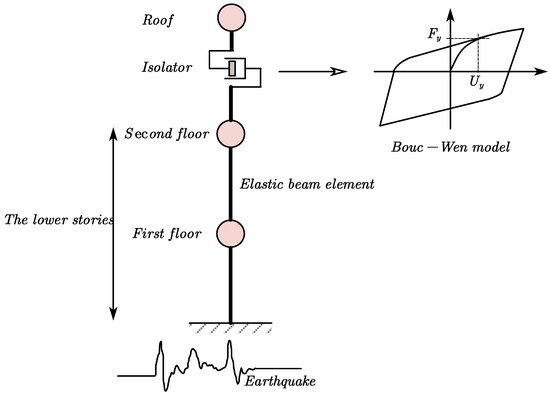 The literature [52] reports the existence of a prototype three-story steel skyscraper of this particular kind. Figure 2 presents a visual depiction of the MDOF lumped-mass model. The graphic presented illustrates the simplification of each layer as a lumped mass, with the roof being isolated by the implementation of isolators. The floor-to-floor height is 3.96 m. The effective stiffness is 3000 N/mm in the horizontal direction. The vertical connection of each floor is modeled by the elastic beam element. The column bases are modeled as fixed at the ground level to the ground. The Bouc–Wen model, which is extensively employed in the simulation of isolators, is used to illustrate the behavior of isolation. The initial proposal of this model by Bouc in 1967, followed by subsequent modifications by Wen, provides a description of the characteristics of the isolation system [53,54]. The elastic time history analysis is performed with SAP2000. Table 4 presents the mass data and dynamic parameters of the model. It is important to acknowledge that the vibration period of the roof-isolated model is denoted as CTi, in order to distinguish it from the vibration period of the non-isolated model, Ti. The lumped-mass model and Bouc–Wen model are depicted in Figure 2. The dynamic properties of the lumped-mass model is shown in Table 5.