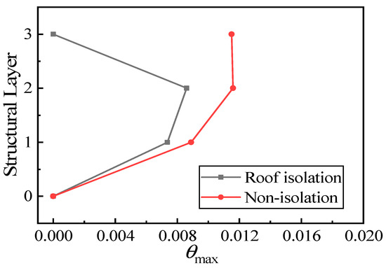 The average inter-story drift ratio of both the roof-isolated and non-isolated structure under the far-field record is illustrated in Figure 4. The standard derivation of the maximum inter-story drift ratio is 0.0038 for the roof-isolated model and 0.0047 for the non-isolated model. The displacement curve of the non-isolated model exhibits a bending deformation pattern. After the roof isolation, there is no significant change in the base shear and the of the first floor. As the number of floors increases, the inter-story drift ratio gradually decreases. Due to the use of roof isolation, the motion pattern of the roof changes to translation under the action of an earthquake, and the becomes almost zero.