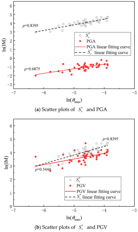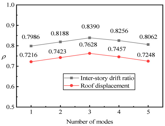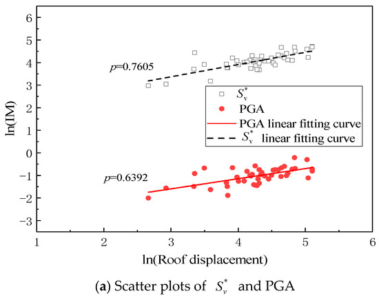 The efficiency is evaluated using Equation (4) and the closer the Pearson coefficient is to 1, the higher the efficiency of the intensity measure. Taking the roof mass ratio into consideration, as is illustrated in Equation (1), the proposed intensity measure is rewritten as . Figure 5 illustrates the scatter plots and correlation coefficients of . The correlation coefficients of and are 0.6875 and 0.8395, respectively. The improvement in the correlation coefficient indicates a higher efficiency of the velocity-related intensity measure. In addition, the comparison between the most common used velocity-related intensity measure (the PGV measure) and the proposed parameter indicates that it is necessary to contain the velocity spectrum and the higher modes. The correlation coefficients increase significantly from 0.5444 to 0.8395.