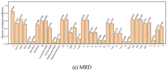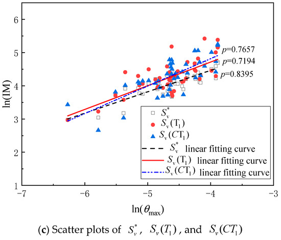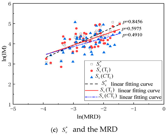 In addition to the MIDR, the MRD is another widely used EDP. Figure 5 presents the scatter plots of the IMs and the MRD. Despite the different correlation coefficient values, the Pearson coefficient of is much closer to 1 compared with the PGA and PGV measures, which is similar to the cases of the MIDR. Compared with , the Pearson coefficient of is improved from 0.6949 to 0.7605. The increment in the Pearson coefficient denotes the necessity to account for the isolated mass ratio, as can be seen from Figure 6c.