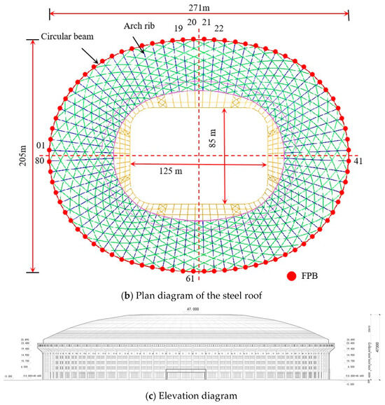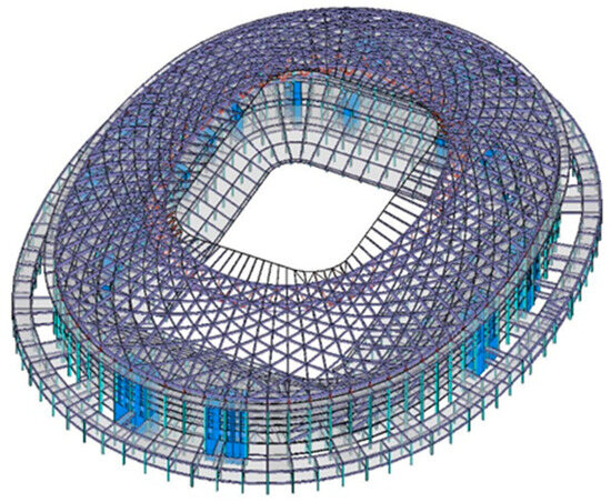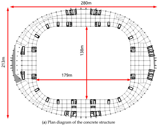 The renovation and reconstruction of the Beijing Workers’ Stadium was finished in 2022. The main structure consists of a concrete frame-shear wall structure system and a large-span roof. The Beijing Workers’ Stadium has three underground floors and six above-ground floors, with a total construction area of 385,000 square meters and a total height of 47 m. The main structure of the stadium has an east–west span of 213 m and a north–south span of 280 m. The plan diagram of the Beijing Workers’ Stadium is shown in Figure 8.