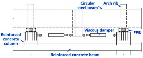 The friction pendulum bearings are installed at the bottom of each arch rib, with a static friction coefficient of 0.035 and a dynamic friction coefficient of 0.015–0.025. In order to reduce the horizontal displacement of the large-span roof under the action of a major earthquake, viscous dampers, which are passive energy dissipation devices [55], are installed between the pier columns and the outer circular beams. The damping coefficient is 130 kN/(mm·s−1), and the damping index is 0.3. The schematic diagram of the connection of the seismic-isolation device for the large-span roof-isolated structure is presented in Figure 9.