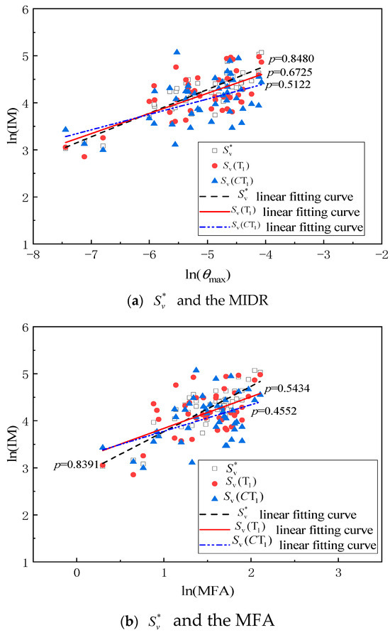 The results of the Pearson coefficients between ln(IM) and ln(EDP) under the selected ground motions are illustrated in Figure 10. In this section, the EDPs examined include the MIDR, MRD, and MFA. The MIDR and MRD, which evaluate the degree of structural damage under earthquakes and local damage, story collapse, and instability, are both widely used EDPs. The MFA is proven to be closely related to the non-structural damage and reflects the level of seismic resilience.