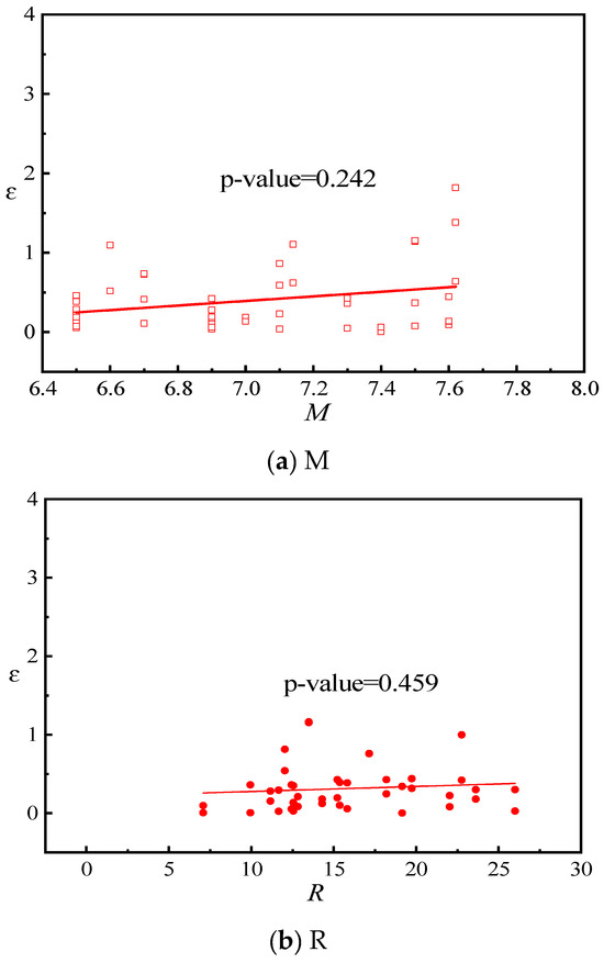 The sufficiency of the intensity measure (IM) can be assessed by regressing the residual term ln(ε|IM) against the seismic magnitude M or the logarithm of the distance R, as indicated by Equations (5) and (6). This allows for the evaluation of the importance of the link between the residual and magnitude M or the logarithm of the distance R. The present study used the F-test method at a significance level of 5% to examine the linear relationship. When the p-value in the regression analysis is less than 0.05, it suggests that the sufficiency of the related independent variable does not match the sufficiency requirements. The findings of the analysis performed for the sufficient evaluation of the suggested intensity measure are presented in Figure 14. The p-value is more than 0.05 in both instances. Consequently, the sufficiency of the is guaranteed.