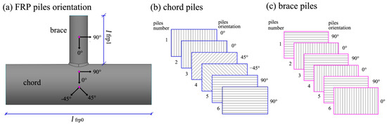 Figure 2 shows the FRP-wrapping orientation and arrangement of each pile. The wrapping lengths on the chord (lfrp0) and brace (lfrp1) were 1200 mm and 300 mm, respectively. S4R shell elements [31] were used to construct the FRP model. Because the interface slippage between the steel substrate and FRP composite did not appear, a ‘Tie’ constraint was applied for the interaction with the default discretization method, in which the FRP composite was considered the slave surface.