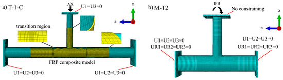 FE simulation can capture the mechanical characteristics of tubular joints and FRP strengthening [11,27,28]. Here, three different CHS T-joints described in the experimental literature were numerically simulated to verify the FE calculations: T-1, a T-joint under brace axial compression [29]; T-1-C, a T-joint with FRP wrapping under brace axial compression [29]; and M-T2, a T-joint under IPB [30]. The FE simulations were conducted using ABAQUS 2021 commercial software [31].