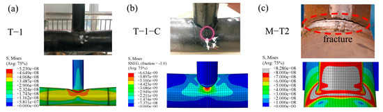 The experimental failure modes were well captured by the simulated results; a detailed comparison for all three models is made in Figure 4. The high-stress area on T-1 (Figure 4a) coincides with the area of joint yielding and major deformation. The fibre-tearing observed in the specimen of T-1-C also appears in the corresponding region of the FRP model (in Figure 4b) accompanied by an evident stress concentration. Brace fracture was observed in M-T2, in the region that reached fracture strain in the simulation (Figure 4c).