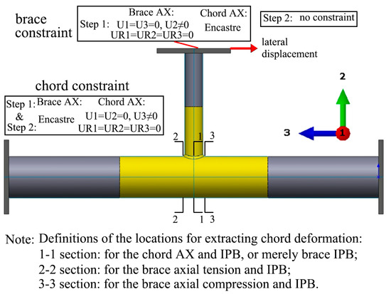 The loading instructions and boundary conditions of the numerical models are illustrated in Figure 6. The brace or chord AX was imposed first; then, the IPB was applied. The chord AX was held fixed while the IPB moment was acting. The brace AX was discontinued in the second step to avoid the secondary moment from the inclination and axial force of the brace. However, the brace AX changed the stress status and deformation of the joint. The loading was executed by the corresponding displacement method.