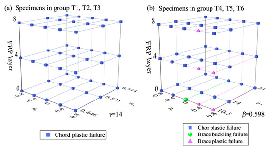 - There are three main failure modes: chord plastic failure, brace plastic failure, and brace buckling failure. A small γ promotes brace-related joint failure, and the combination of IPB and brace tension can cause plastic failure of the brace. However, a sufficient number of FRP layers can make chord plasticity the main failure mode. The increase in FRP reinforcement could compensate for the thinner brace thickness and yield results equivalent to those obtained with joints with a larger γ.