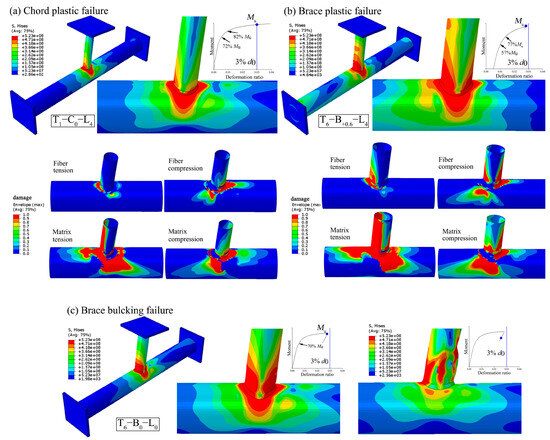 The contours of the Mises stress on the steel member and the Hashin damage [33] of the FRP composite in three typical specimens (T1-C0-L4, T6-B+0.4-L4, T6-B0-L0) are plotted in Figure 8. The damage conditions of fibre and matrix in FRP composite are exhibited in envelope calculation [31], where a damage degree of 1.0 means complete failure. Typical moment-deformation curves of each failure mode are also shown, with the loading state of the displayed contour denoted indicated by a bold dot.