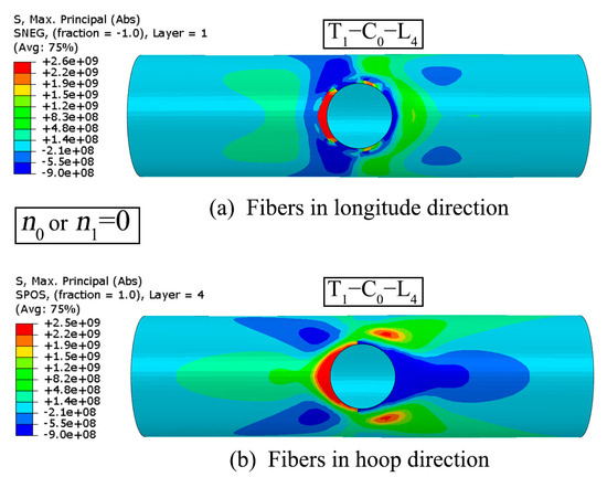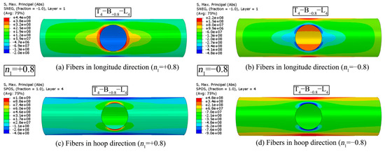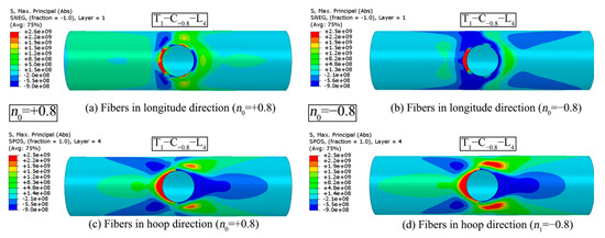 The fibres’ stress contours at the completion state of the brace AX for T4-B+0.8-L4 and T4-B−0.8-L4 are plotted in Figure 12. The AX was transmitted from the brace to the chord along the longitudinal direction at the crown points [13]. As shown in Figure 12a,b, the longitudinal fibres efficiently contributed to load bearing; they exhibited more high stress around the interaction region than hoop fibres. A widespread high-stress area could be observed on the bottom of the chord in longitudinal fibres for its overall chord bending. High stress also occurred on the side wall of the hoop fibres, as indicated in Figure 12c,d.