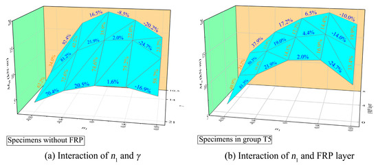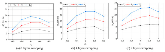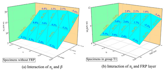 Figure 17b illustrates the effect of the interaction between n1 and layer count on the ultimate moment for group T5. The added FRP layers strengthened IPB resistance and weakened the effect of n1. For instance, the strength fluctuation as n1 went from −0.8 to −0.4 changed by 81.3% without FRP, but 50.3% and 37.9%, respectively, with four and eight FRP layers. However, the efficiency of the FRP reinforcement was gradually reduced as the layer count increased. As the number of FRP layers increased from 0 to 4, the joint strength (at n0 = +0.8) was enhanced by 33.4%, but going from 4 to 8 resulted in an improvement of just 19.9%.