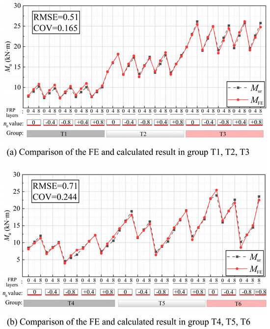 FE simulated results (MFE) are compared with calculated results (Mur) of Equation (14) in Figure 18. The proposed strength calculation for groups T1 to T3 was within an error range of [−6%, +9%]. However, because of the serious effects of the brace force on the IPB resistance, a relatively unsatisfactory discreteness of the strength comparison was found for groups T4 to T6, showing an error range of [−19%, +18%]. The root-mean-square error (RMSE) and COV of the fitting precision were acceptable (Figure 18a,b). Therefore, the proposed strength equation can calculate the IPB resistance of FRP-reinforced CHS T-joints impacted by axial loading from the chord or brace.