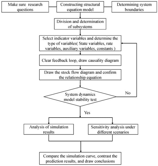 The establishment of a system dynamics model is generally carried out according to the following analysis process: (1) define the problem and divide the boundary of the system, (2) propose assumptions, (3) determine the influencing factors, (4) establish a causal relationship diagram, (5) analyze the causal relationship, (6) draw a stock flow diagram, (7) determine the model, (8) set the model parameters, (9) test the model, (10) analyze simulation results, and (11) perform sensitivity analysis under different scenarios [28]. The specific steps are shown in Figure 1.