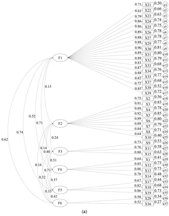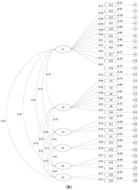 Confirmatory factor analysis model of measurement model. (a) Unmodified measurement model. (b) Modified measurement model.