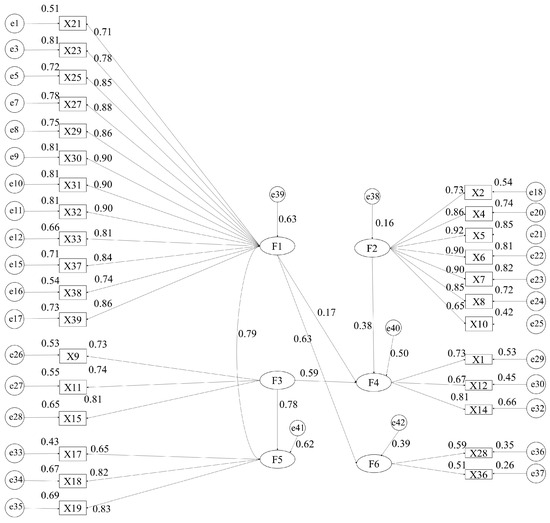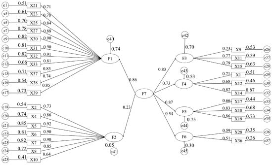 According to the standardized path coefficients between the latent variables in the modified first-order structural model, it is found that the correlation between the latent variables is strong, and the model with a good overall fitting degree after correction still has more observed variables. Therefore, there is a higher level of common factor in the six potential factors of the modified first-order structural model; that is, the external potential variable is the application and development of BIM and new-generation information technology in the construction industry (F7). Then, AMOS 24.0 is used to build the second-order confirmatory factor analysis model, and the maximum likelihood method is used to estimate the parameters. The analysis results are shown in Figure 4. As shown in Table 7, each index of the second-order confirmatory factor analysis model meets the standard [20], and the fitting degree of the structural equation model is good.